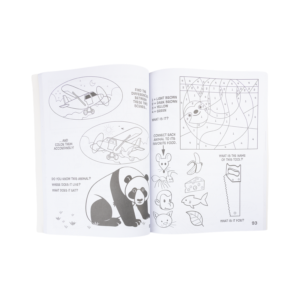 - Includes: Mazes, dot-to-dot puzzles, coloring pages, word searches, brain games.